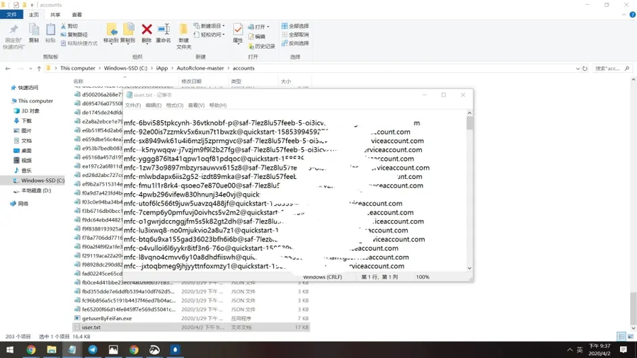 但我推荐你一个更好的办法,提取sa的bat,放到你的AutoRclone 文件下面的 accounts 文件夹 运行一下,他就会提取你的Json文件的邮箱 并自动生成一个txt
