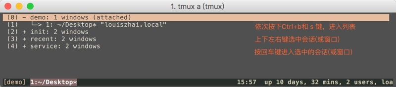 12如果刚好处于会话中怎么办?别担心,我们可以使用对应的tmux快捷键Ctrl+b + s,此时tmux将打开一个会话列表,按上下键(⬆︎⬇︎)或者鼠标滚轮,可选中目标会话,按左右键(⬅︎➜)可收起或展开会话的窗口,选中目标会话或窗口后,按回车键即可完成切换。