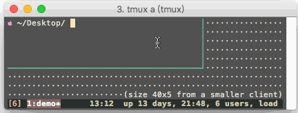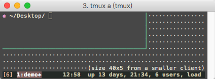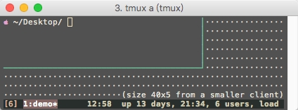 tmux默认会同步同一个会话的操作到所有会话连接的终端窗口中,这种同步机制,限制了窗口的大小为最小的会话连接。因此当你开一个大窗口去连接会话时,实际的窗口将自动调整为最小的那个会话连接的窗口,终端剩余的空间将填充排列整齐的小圆点,如下所示。