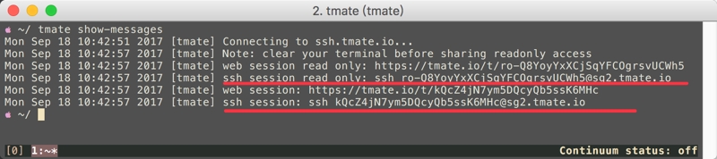 会话共享(适用于结对编程或远程教学),将 tmux 会话的地址分享给他人,这样他们就可以通过 SSH 接入该会话。如果你要给同事演示远程服务器的操作,他不必直勾勾地盯着你的屏幕,借助tmux,他完全可以进入到你的会话,然后静静地看着他桌面上你风骚的键盘走位,只要他愿意,甚至还可以录个屏。