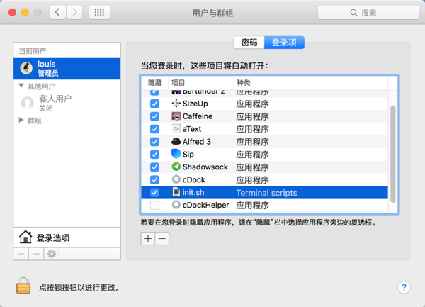 然后,打开 系统偏好设置 - 用户与群组 - 登录项,点击添加按钮+,选择刚刚保存的init.sh脚本,最终效果如下: